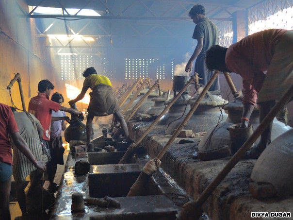The attars are made using the centuries old copper vessels called Deg (Kettle) or Stills and Bhapka (Receiver). The Deg & Bhapka system is based on hydro distillation technique is also made of copper having openings for connections to one or two receivers. The Deg capacity range between 10 and 160 Kilos of floral/herbal material. First, filing the plant in the Deg with the requisite amount of water, the lid is sealed with a mixture of cotton and clay. The Deg is heated on wood and cow dung cakes fire. The temperature is controlled by putting in more wood/cow dung cakes or by removing the same. While boiling the raw material in the Deg there is considerable increase in pressure inside the Deg. To prevent the lid from blowingoff, a leaf spring called Komoniis used on the top of the lid. The Bhapka is copper made and generally round in shape with a long neck. The fragrance of flowers (raw material) is obtained by condensing vapours into the base material, which is primarily sandalwood oil.